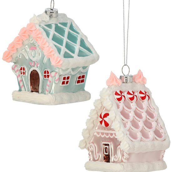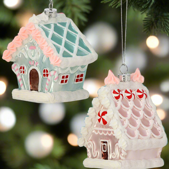 These gorgeous mini Gingerbread style 5" Retro Glass Sweets House Ornaments are the perfect embodiment of midcentury style and Gingerbread charm. Choose from aqua or pink glass houses in soft hues decorated with pink and white frosting! Such a "sweet" addition to any tree or decor.