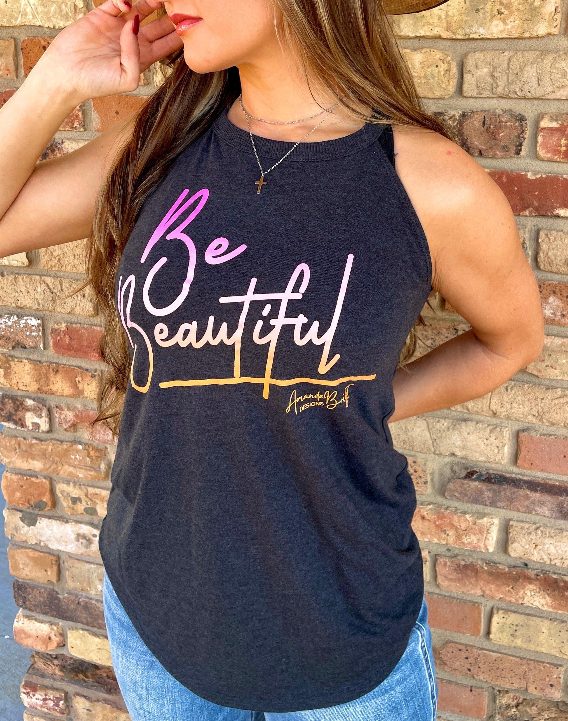 Slip into this dreamy dark gray tank featuring our iconic BE BEAUTIFUL tagline in vibrant sunset hues! This super-soft, ultra-flattering top plays nice with jeans and shorts all year round and has a comfort fit neckline that shows off the prettiest part of your shoulders. Each screen-printed design has its own personality—no two are exactly alike! The perfect mix of comfort and sass for your everyday adventures.