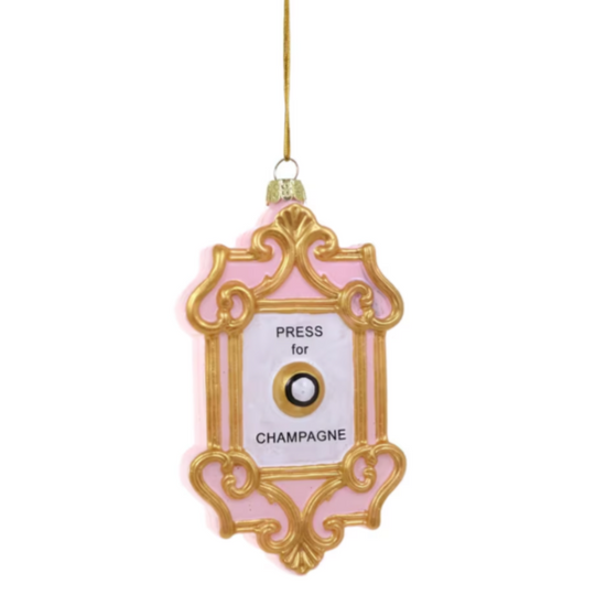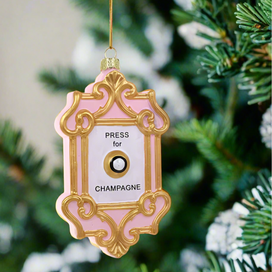 In case of emergency, just press the button for champagne! One of the top-selling ornaments by Cody Foster & Co. that always hits THE FAV LIST is this Champagne Button Ornament made of glass with a white button in the middle surround by pink and gold details. Use as needed!