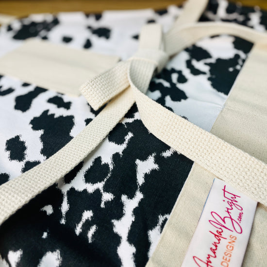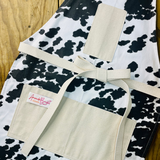 The Cheyenne Apron showcases a stunning black and white cowhide scattered print that'll have you saying "yeehaw" in the kitchen! Whether you're whipping up treats, hosting a shindig, crafting up a storm, or searching for that perfect gift for your cowboy-loving friend, this apron's got you covered. Keep it at home or spruce up your vacation rental with this charming piece! Sporting natural cotton webbing strings and canvas pockets, this 100% cotton beauty is proudly Texas-made, fully lined, and with its extra long strings it's roomy enough to fit up to size 1X. Giddy up and get cooking!