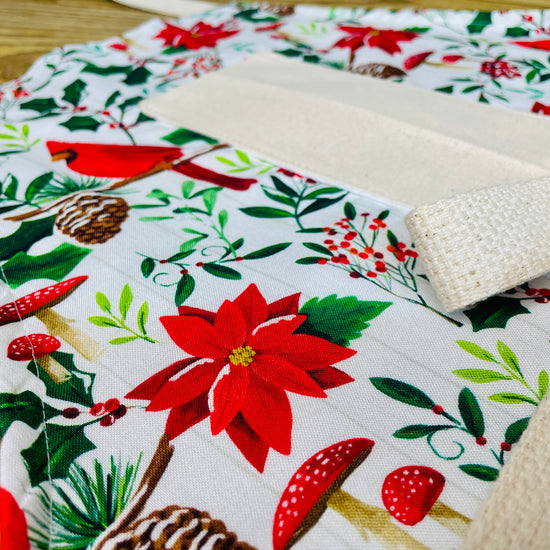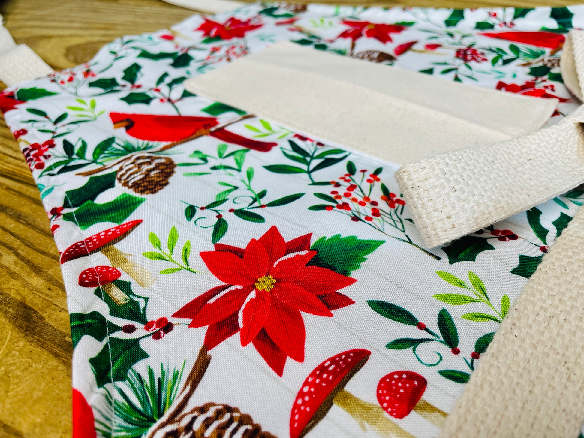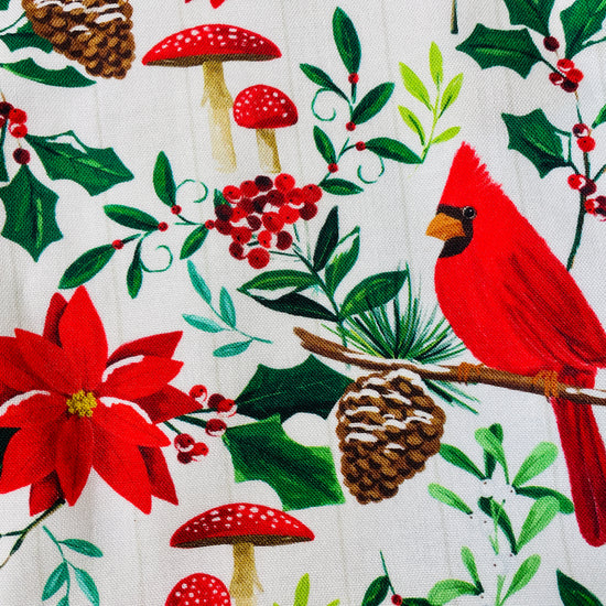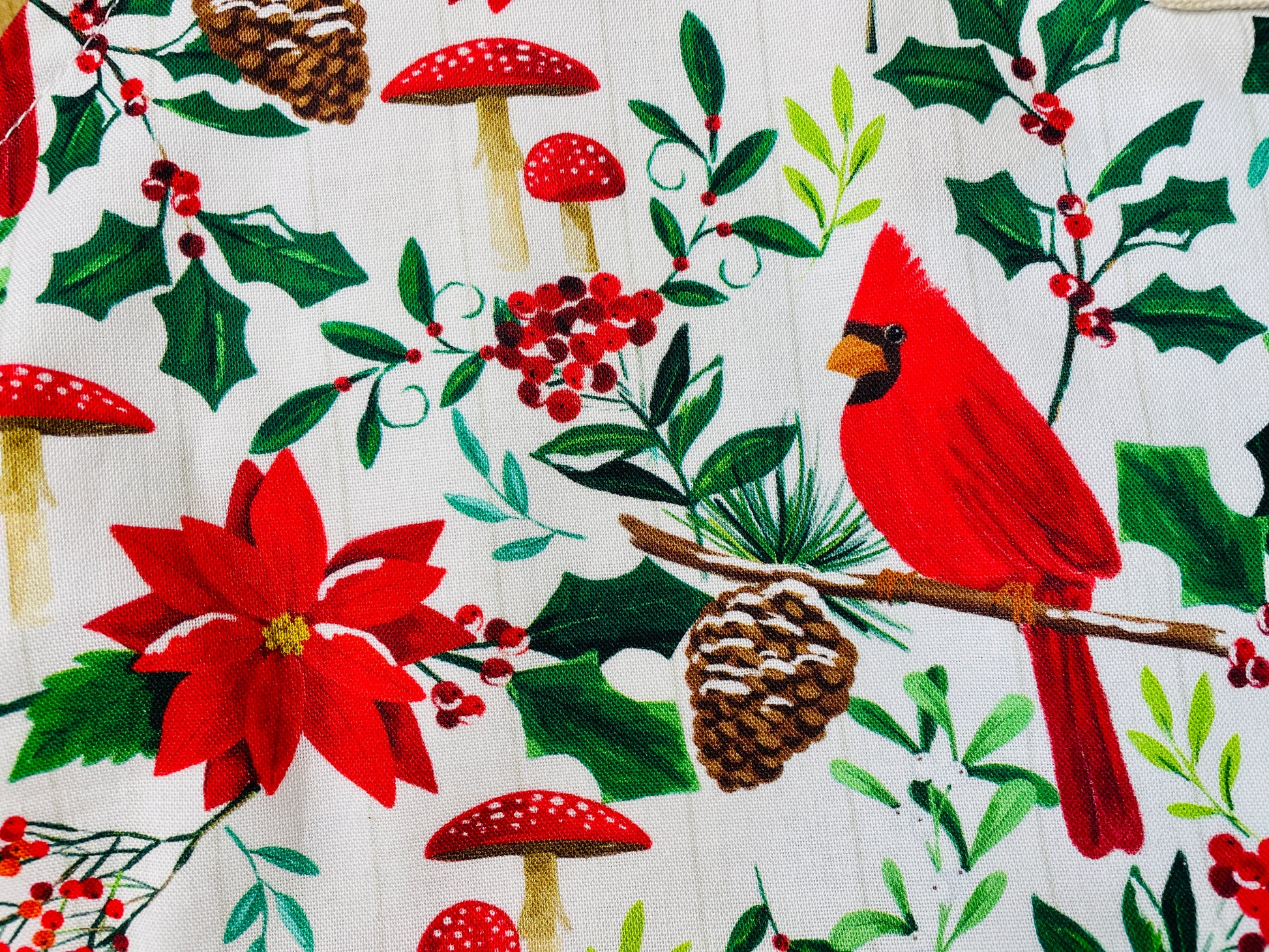Christmas Cardinal is an enchanting holiday apron for the nature lover with cardinals, poinsettia, mushrooms and pinecones that bring the outdoor beauty of the holidays into your home.