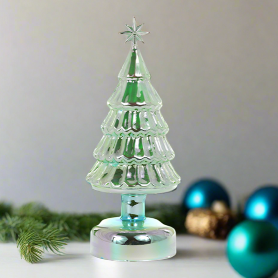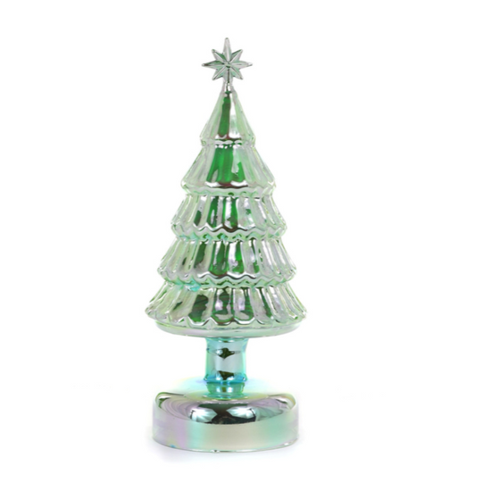 Add a little extra color and shine to your home with this gorgeous 4-tiered Cody Foster Iridescent Lighted Green Glass Tree. It lights with a switch on the bottom turns on a lovely string of LED lights inside. What a unique decoration!