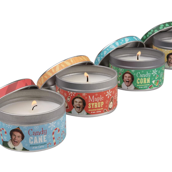 Light up your home or office with this uniquely crafted collectible homage to 2003's movie Elf with FOUR CANDLE TINS featuring delightful scents inspired by the elves' four main food groups- Candy, Candy Cane, Candy Corn, and Maple Syrup! 100% Santa approved.