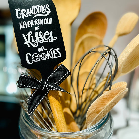 This heavy duty silicone baking spatula says "Grandmas Never Run Out of Kisses or Cookies" on front and features the cutest hearts and cookies on the back. A perfect gift to show your Mother or Grandma how much you appreciate her during the holidays!
