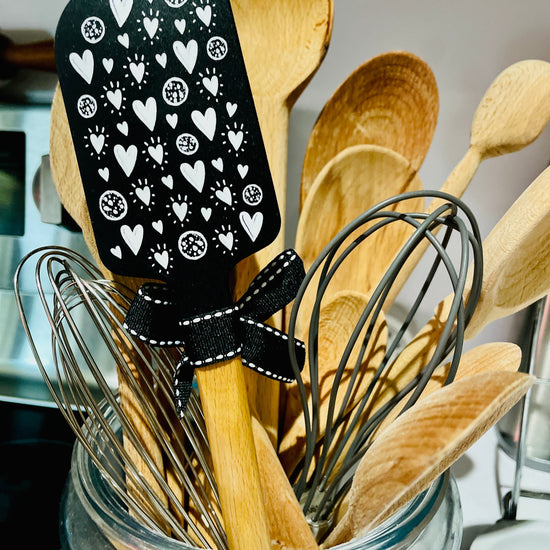 Comes dressed for gifting with a gorgeous black and white bow at the neck and matching ribbon loop for hanging. Features beautiful solid wood handle. Heat resistant up to 375 degrees. Not microwave safe. Measures 2.50" x 13" x 0.50"