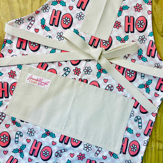 Our Couture HO HO Holiday Apron captures the trendy checkered flag style perfectly for the holidays with pink lettering, striped candy canes, mistletoe, hearts and flowers on a pink and white checkered background. This limited-edition petal cotton apron is fully lined and crafted 100% in the USA. Practical and durable, they include sturdy cotton canvas pockets—a top pocket perfect for glasses or spoons, plus spacious bottom pockets for your phone, recipes, or tools. Extra-long webbed cotton ties ensure a comfortable fit up to size 1X, combining authentic style with everyday convenience.