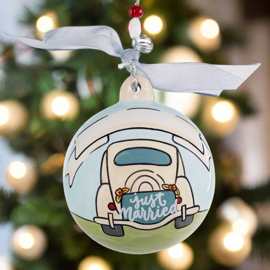 This gorgeous ball ornament beautifully captures the feeling of embarking on the grand adventure of marriage. The stained-glass windows on the church and the "just married" sign on the car capture the details of a beautiful day to celebrate your journey together!