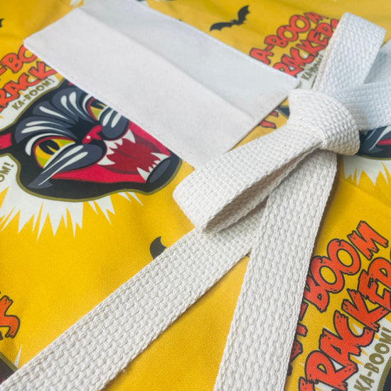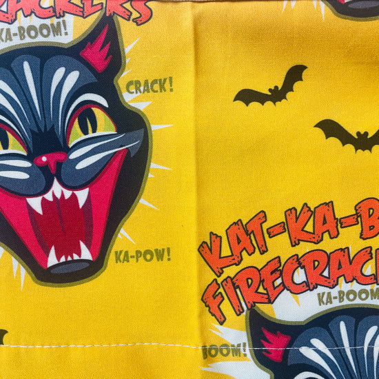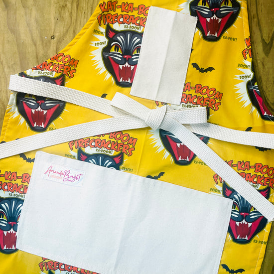 Our Couture Ka-Boom Apron features the famous screaming black cat from Black Cat Fireworks, known as the best fireworks in America! This designer print features the iconic screaming black cat fanged face paired with wording that says "Kat-Ka-Boom Firecrackers" and features bats in signature colors of red and black on a gold background. Perfect for cooking, entertaining or to put you in the holiday mood! This limited-edition petal cotton apron is fully lined and crafted 100% in the USA. Practical and durable, each apron includes sturdy cotton canvas pockets—a top pocket perfect for glasses or spoons, plus spacious bottom pockets for your phone, recipes, or tools. Extra-long webbed cotton ties ensure a comfortable fit up to size 1X, combining authentic style with everyday convenience.