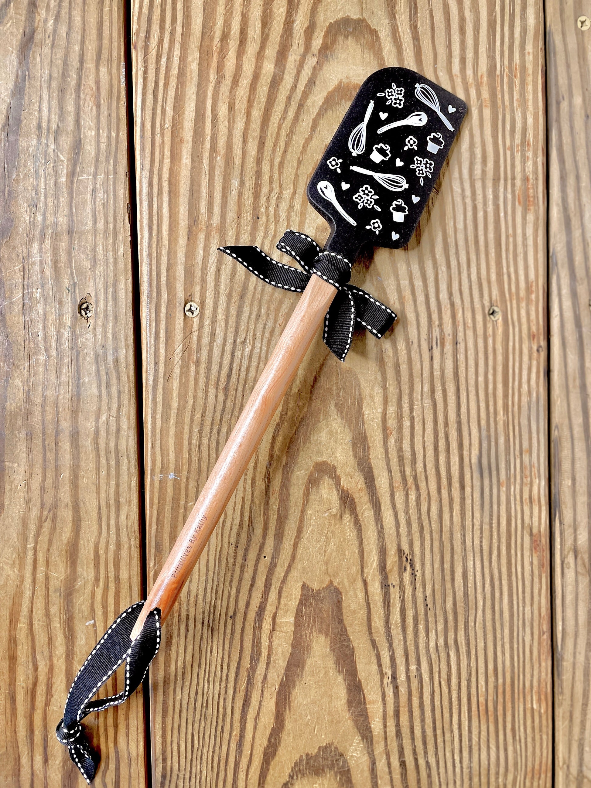 Comes dressed for gifting with a gorgeous black and white bow at the neck and matching ribbon loop for hanging. Features beautiful solid wood handle. Heat resistant up to 375 degrees. Not microwave safe.