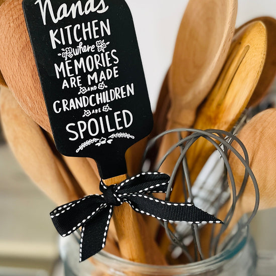 Nana would be so proud to see your kitchen achievements! And this is truly the place "where memories are made and grandchildren are spoiled." This double-sided spatula is very high quality, makes a great birthday, Mother's Day, Christmas or hostess gift combined with our Two Medium Sized Ladies Aprons! Features whisks, cupcakes and spoons on the back.