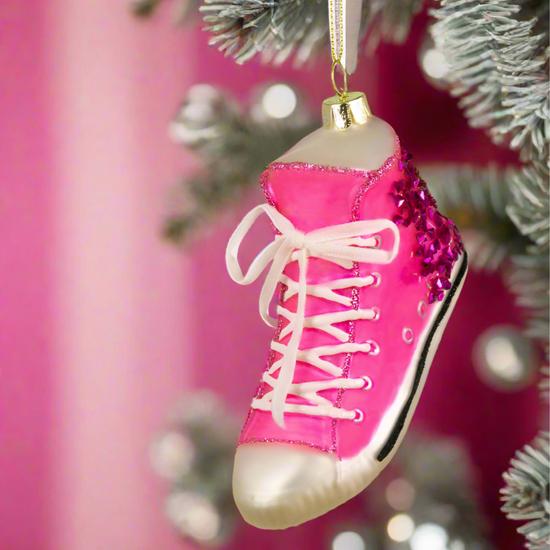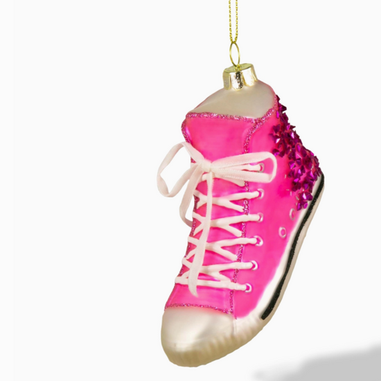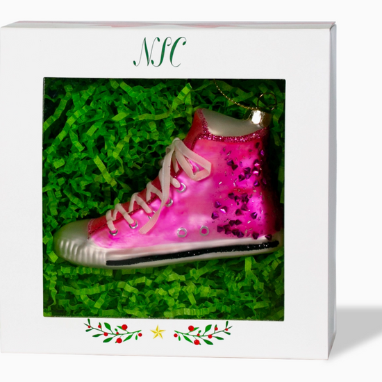 This ornament is so fun we want to wear it! This beautiful glass ornament is a pink high top sneaker with white soles, laces and chunky pink glitter on the back - plus the bow on the laces is fabric! Stunning pop culture ornament comes ready to gift or to save in a keepsake box with colorful paper shredding.