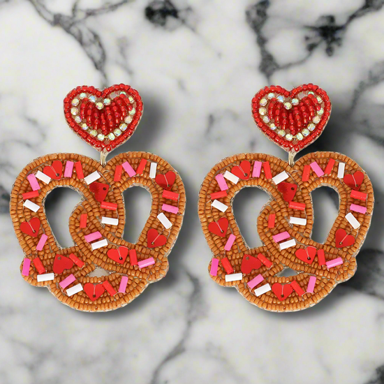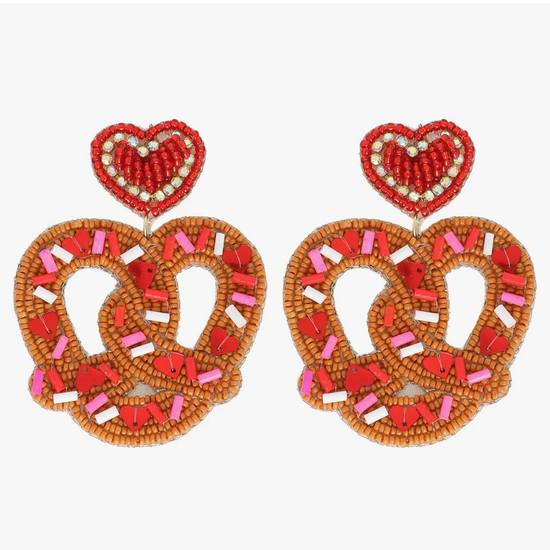 Our pink, red and white pretzel seed bead earrings are the perfect accessory for the food-obsessed soul!