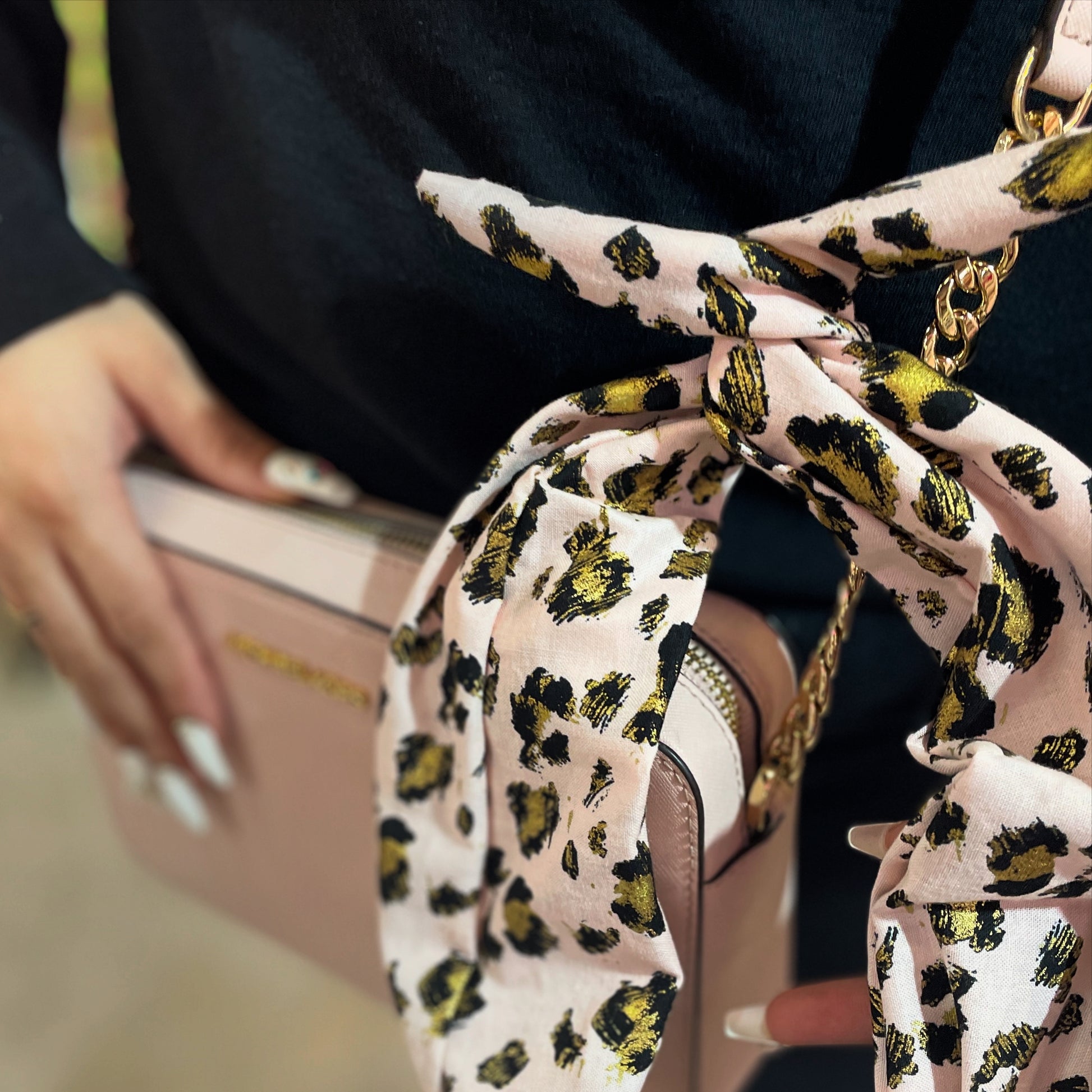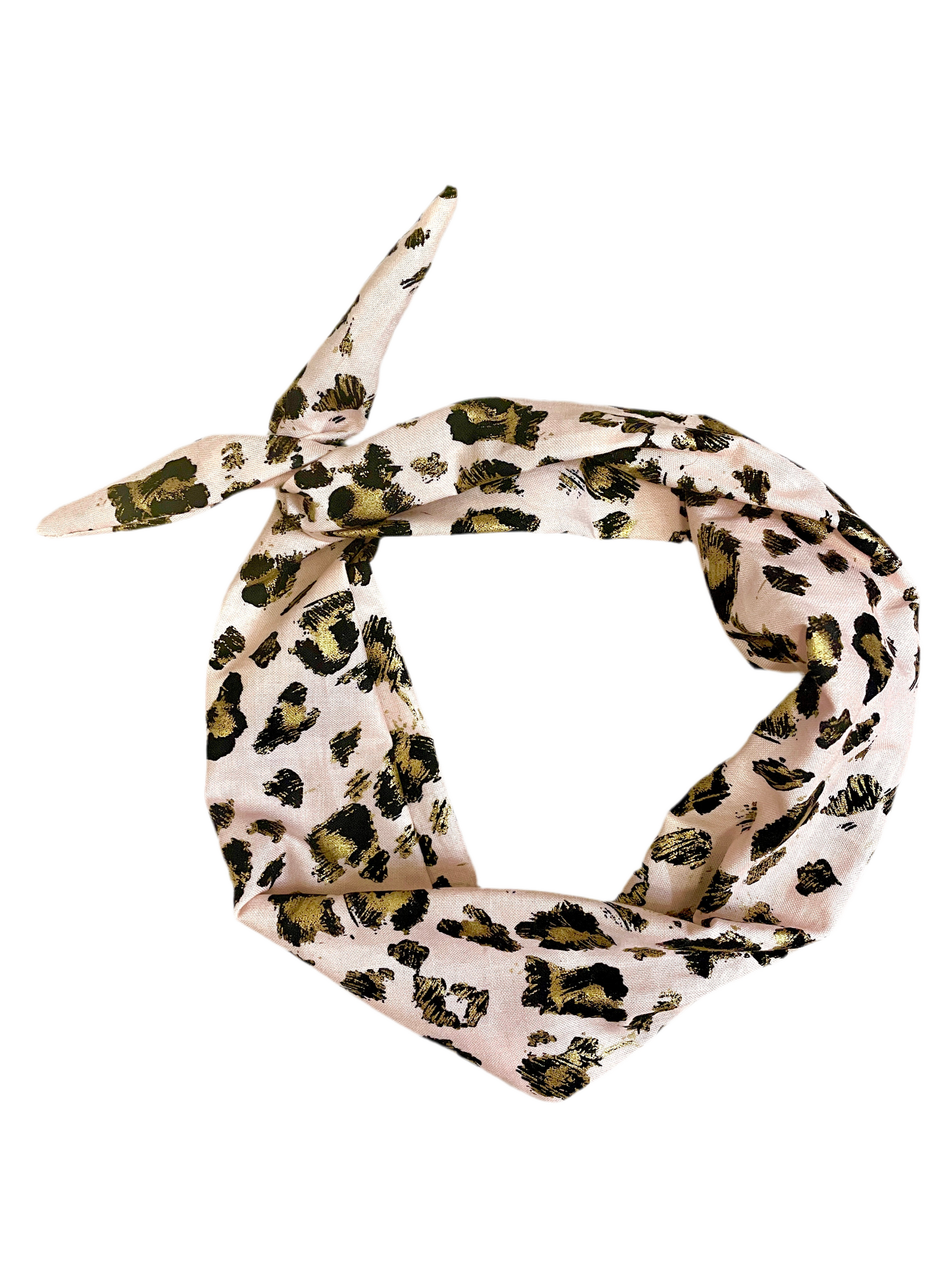 This Original Tie Headband features a black and gold brushed leopard print on a blush pink background. A gorgeous match for those who love animal print and pink!