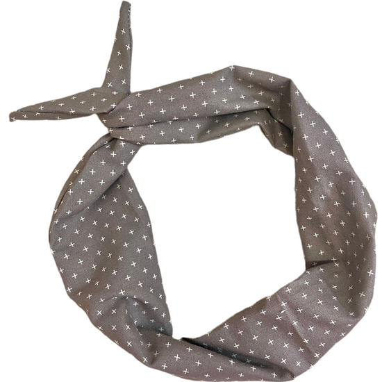 This Original Tie Headband features a soft gray fabric with a small cross repeating pattern. A lovely neutral that is perfect for daily wear.