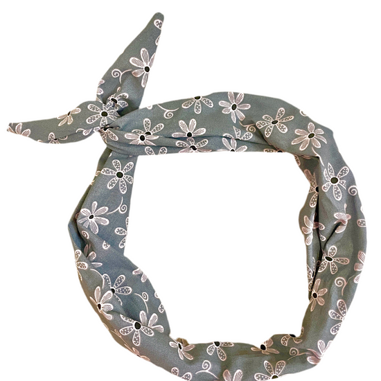 This Original Tie Headband has lacy, baby pink daisies with black dot centers over a gray background. A perfect headband for neutrals.