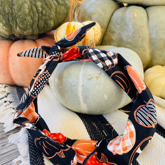 This Original Tie Headband features a pumpkin patch full of orange patterned pumpkins on a black background. Ready for Trick-or-Treating and all your holiday fun!