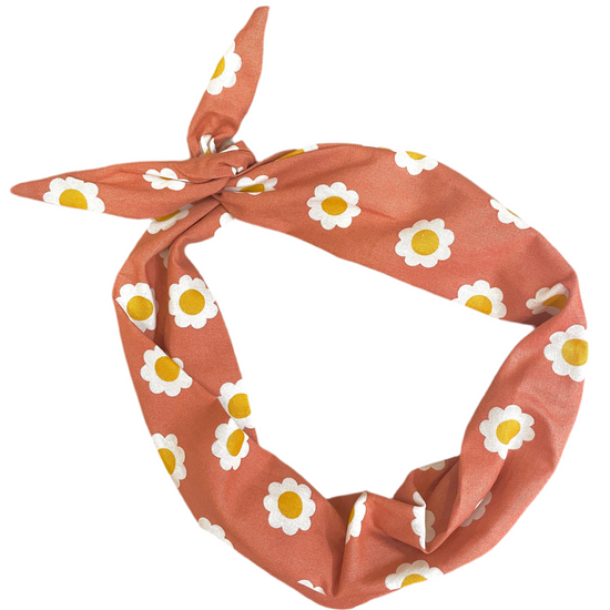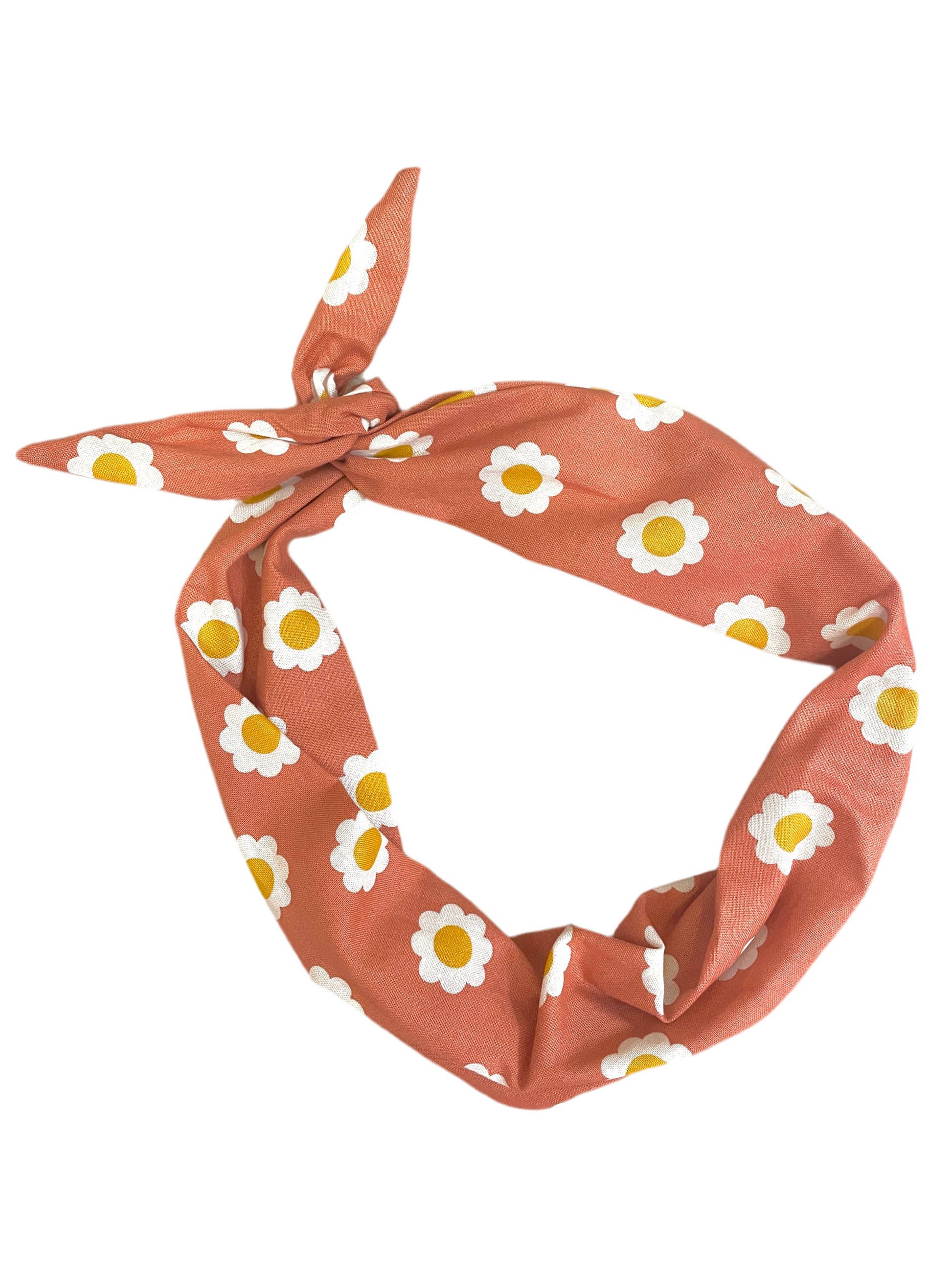 This Original Tie Headband in a deep salmon color with what looks like sunny side up eggs. But make no mistake - this is no egg omelet, it's a stunner!