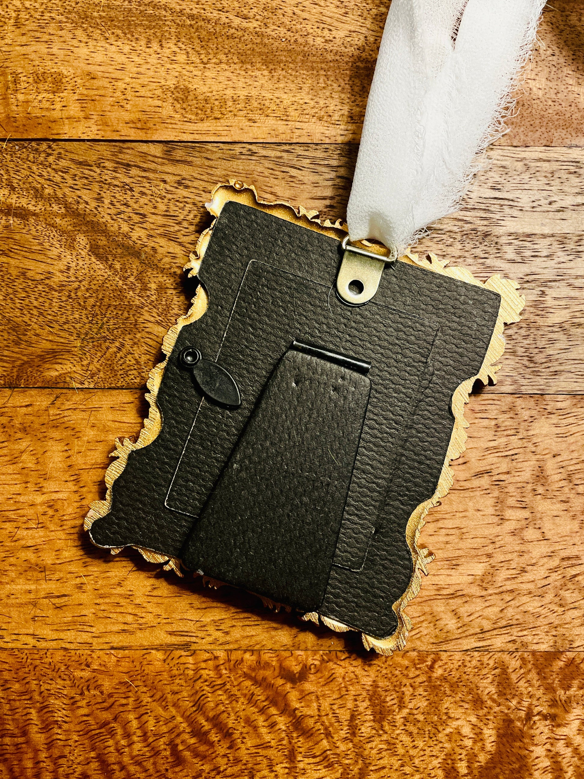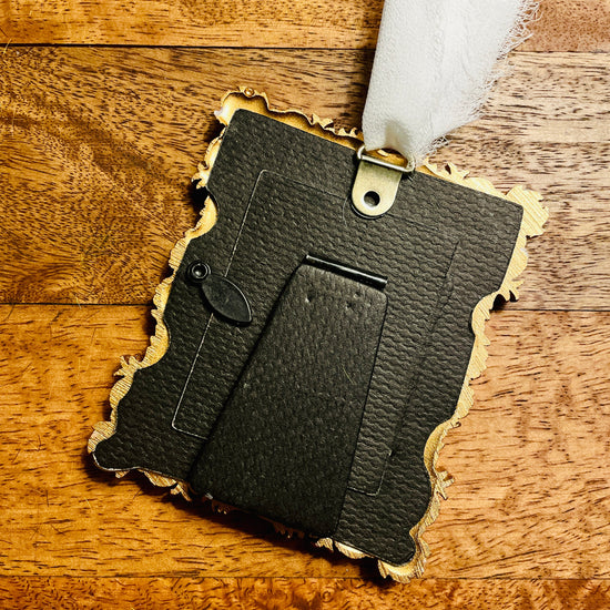 Hand crafted, these prints are encapsulated in ornate gold frames, with a ribbon for flourish. These can be hung as ornaments or on walls, from a chandelier or on a lamp. These intricate prints lend an artistic touch to gifting, whilst offering elegance and individuality to home decor.